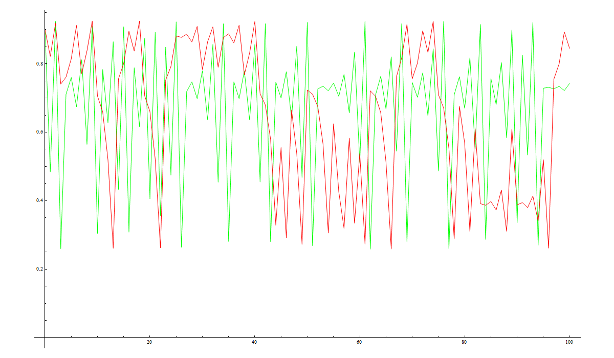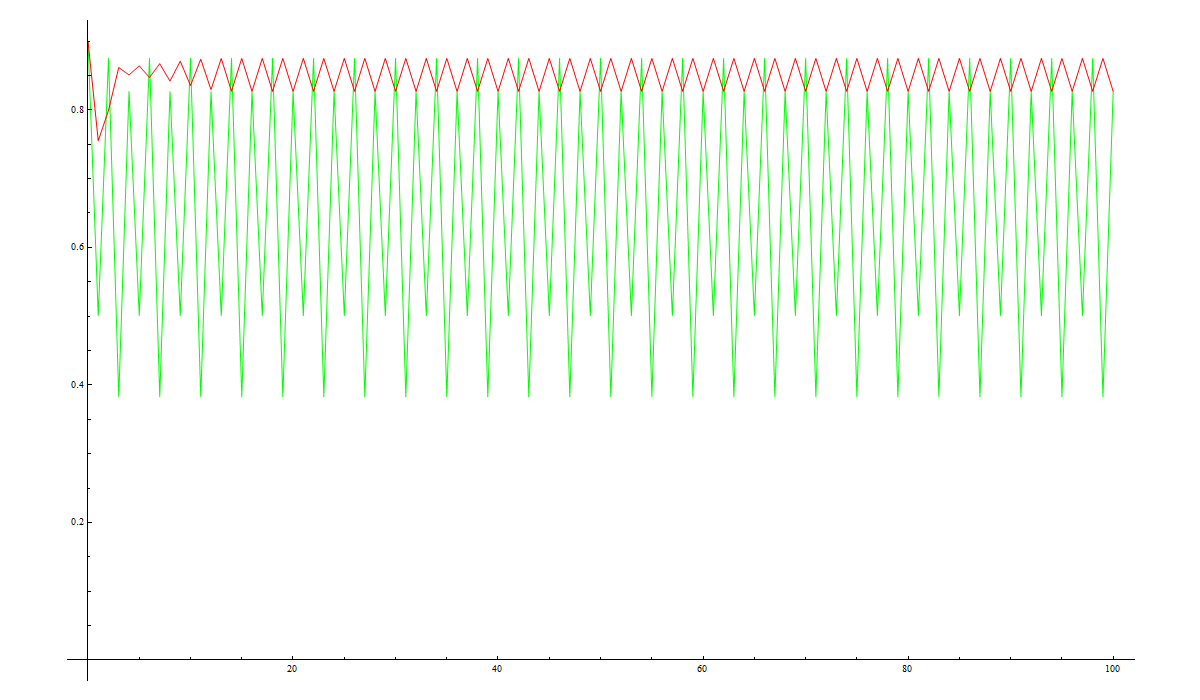 In the graphs below we can see the output from just process ‘A’ in GREEN and the output from process ‘A’ when the input is fed from process B in RED. In both of these cases we start with the same initial conditions for process ‘A’ so that we can compare the effect of behaviour on process ‘A’ of the feedback.