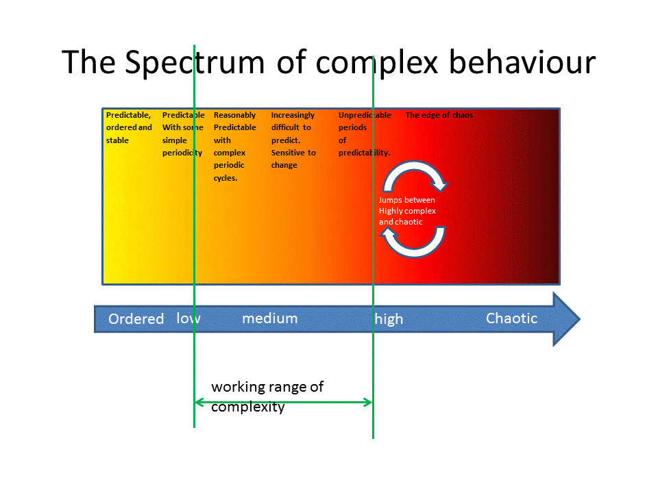 I tend to try to keep complexity as simple as I can and for this purpose I introduced the idea of a spectrum of complexity. This is a continuum of complex behavioural characteristics that starts with highly stable and ordered behaviour then moves through various levels of complex behaviour to end with chaotic behaviour. My first contention is that in reality and by their nature software delivery projects can only span a limited range of the spectrum of complexity.